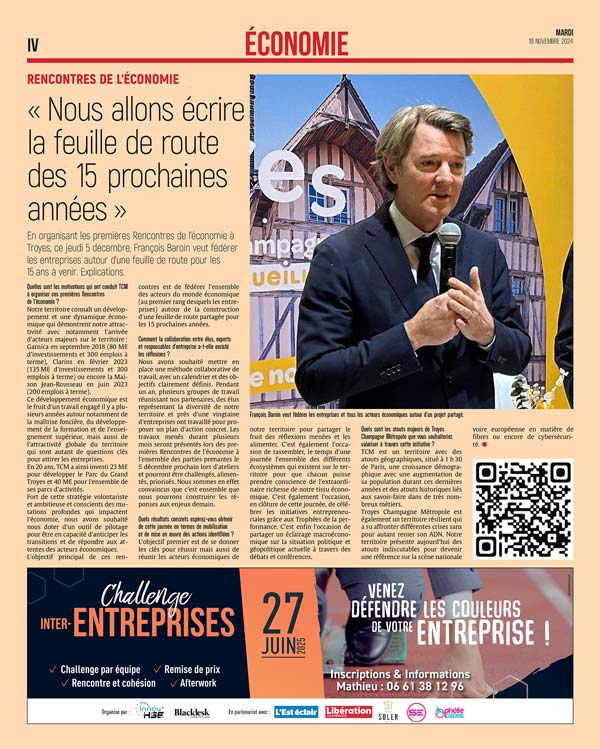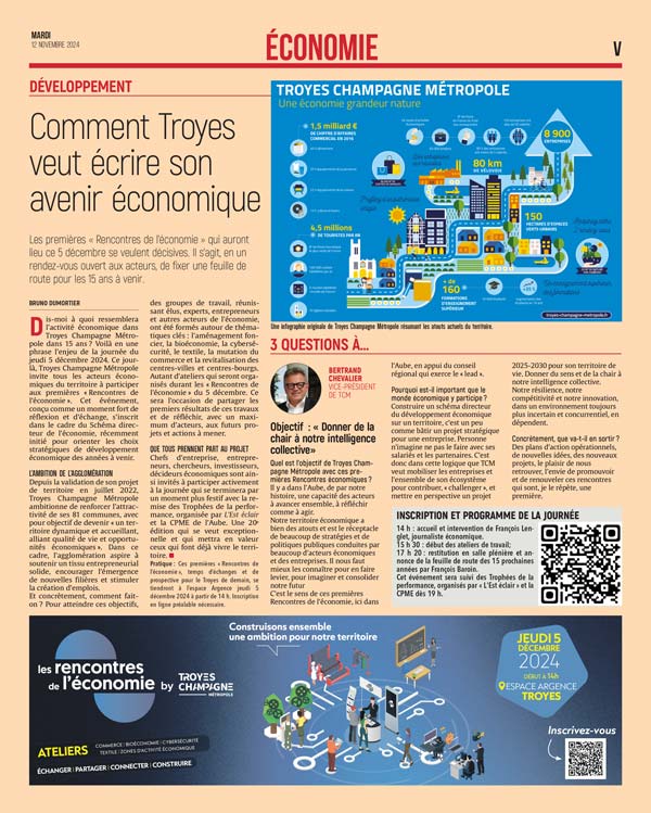 Le fruit de ses réflexions sera présenté lors des « 1ères rencontres de l’économie » le 5 décembre 2024. Vous être chef d’entreprises, entrepreneurs, acteurs de la recherche, investisseurs ou encore décideurs économiques, venez participer à cette grande réflexion pour porter ensemble l’avenir de notre territoire.